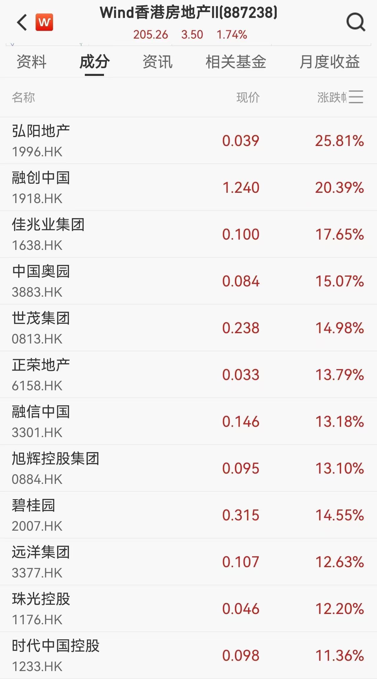 港股市集内房股同步集体走强,其中,弘阳地产涨超25%,融创中国涨超20%,吉兆业集团涨超17%,中国奥园、世茂集团、正荣地产、融信中国、旭辉控股集团、碧桂园、远洋集团等涨超10%。