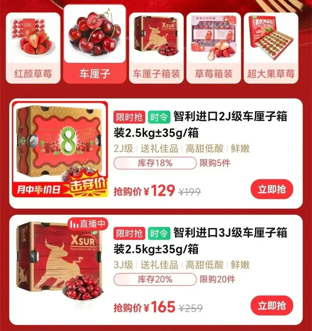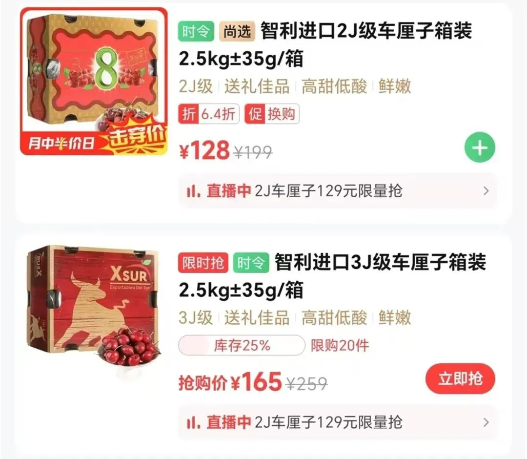 价钱方面,3斤装的1个J车厘子仅需69.99元/盒,而5斤装的2J、3J、4J车厘子则分别为179元/盒、199元/盒和249元/盒。不少顾主在仔细挑选,其中2J等第的车厘子备受嗜好。也即是说,4J车厘子的单价约为50元一斤,而1J的车厘子则只需20多元一斤。