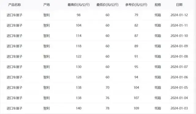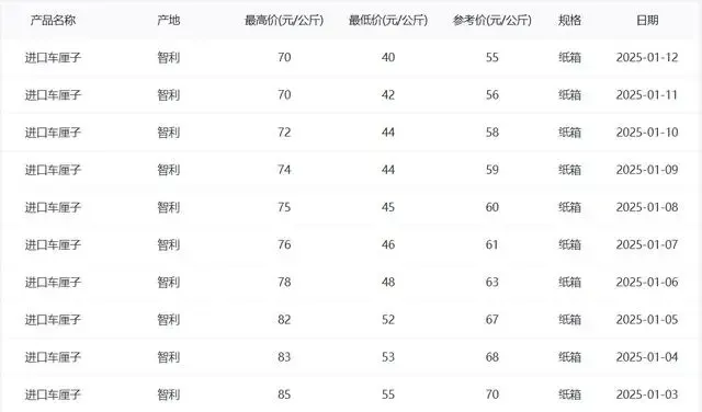 关连数据泄漏,2025年1月3日—12日,智利入口车厘子的价钱不断下滑,参考价从1月3日的每公斤70元下滑到1月12日的每公斤55元,比拟一个月前下滑过半。数据泄漏,旧年1月3日参考价钱为每公斤109元,旧年1月12日参考价钱为每公斤79元。