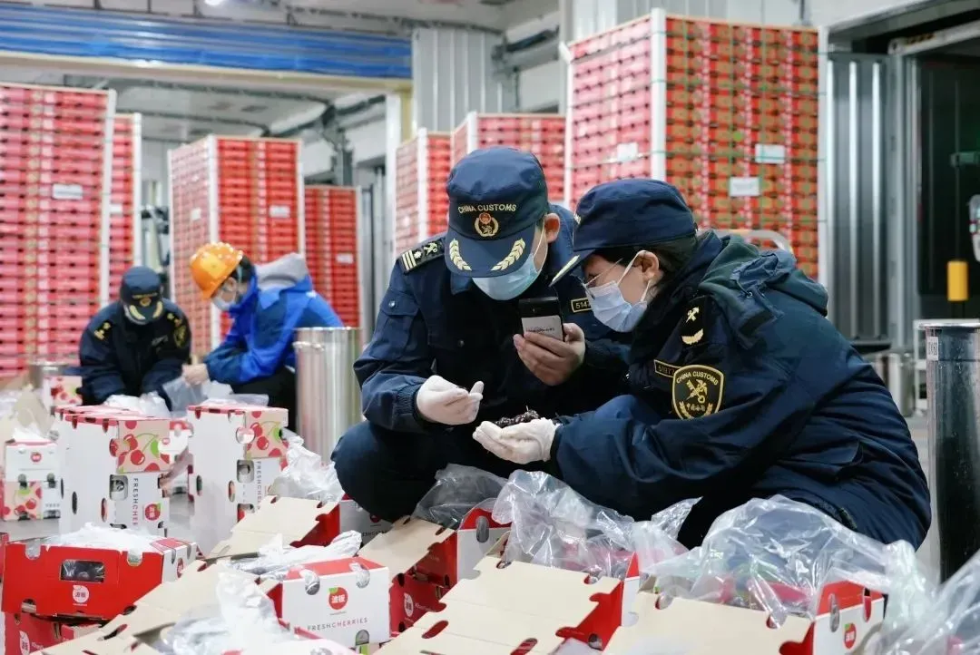 广州海关所属南沙海关关员在对入口智利车厘子进行监管。