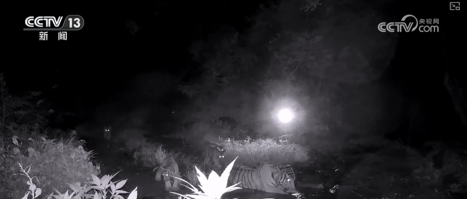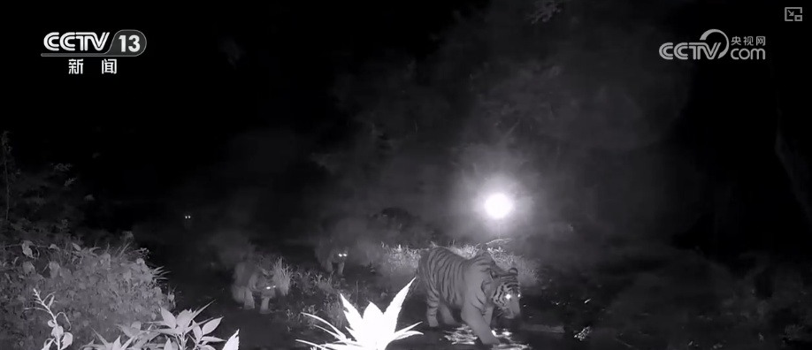 画面中是夜幕覆盖下的珲春山林。一只东北虎姆妈正带着我方的幼崽巡山,触发了布设在路旁的红皮毛机。亮堂的闪光灯下,败露可见虎姆妈走到水边运转俯下身喝水,几只虎崽紧随后来赶来饮水休憩。监测东谈主员盘货数目后发现,这是一个极为目生的“一母带四崽”的五口之家。
