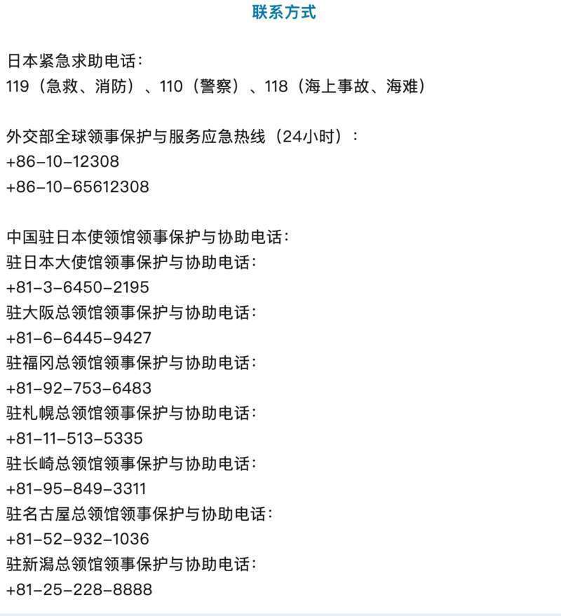酬酢部和中国驻日本使领馆细心指示中国公民近期幸免前去日本,已在日中国公民密切眷注当地顺次情势,提高安全驻防意志,加强自我保护。如遇要害情况,请实时报警并筹商驻日使领馆寻求协助。